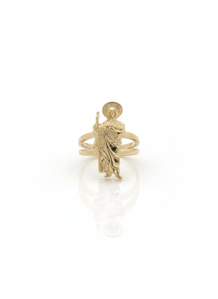Embrace faith and style with this gold-layered San Judas ring, designed for both men and women. Featuring an adjustable, resizable fit, this ring ensures comfort and versatility, making it the perfect piece for everyday wear or a meaningful gift.