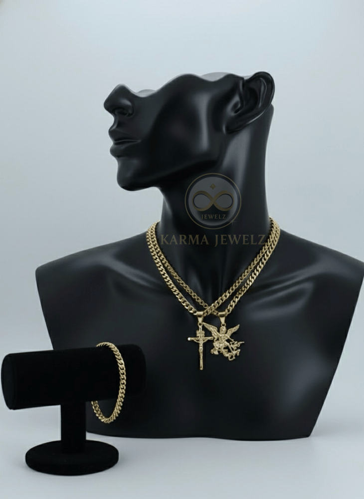 This bundle gives you a complete luxury look—two chains for layering, a matching bracelet, and two iconic pendants with deep spiritual meaning. Designed to turn heads while offering everyday durability.