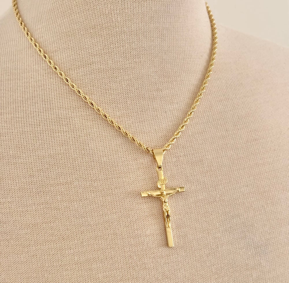 Add a meaningful touch to your look with this stunning 14k gold plated rope chain, featuring a detailed Cross Designed for both men and women.