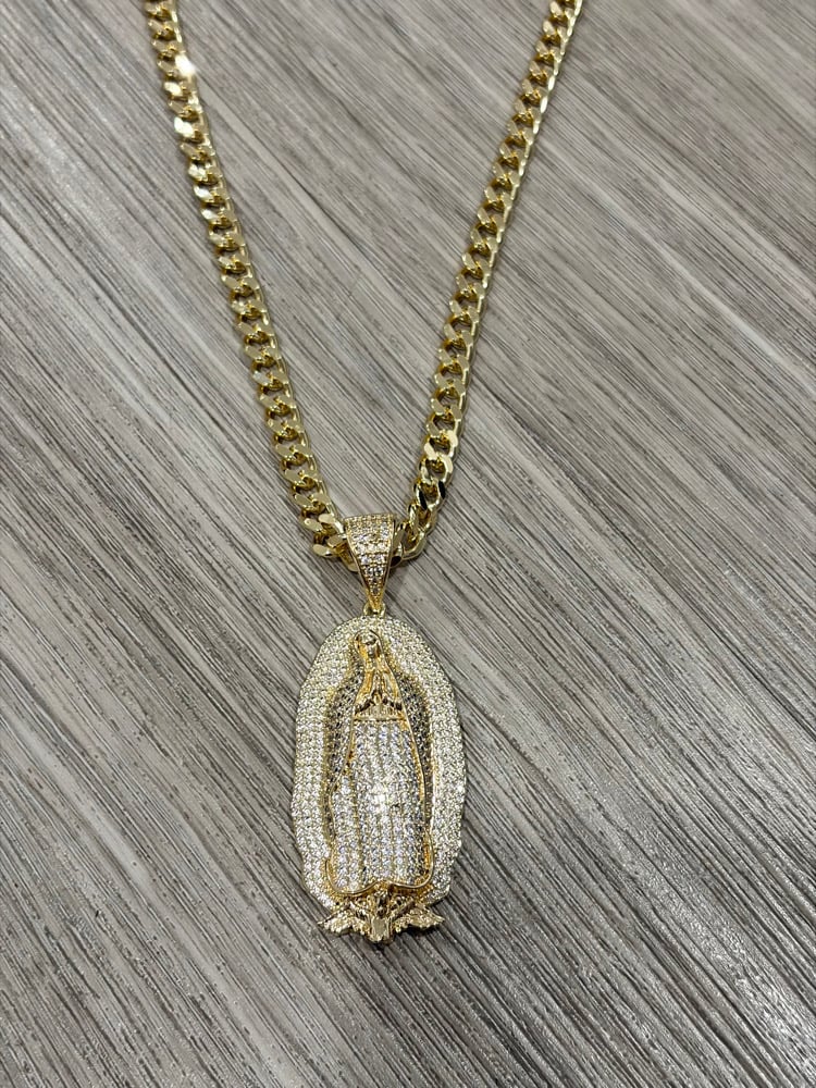 Iced Out St Mary Pendant Necklace 7mm Cuban Chain 24” | 14K Gold Plated Virgin Mary Necklace |