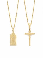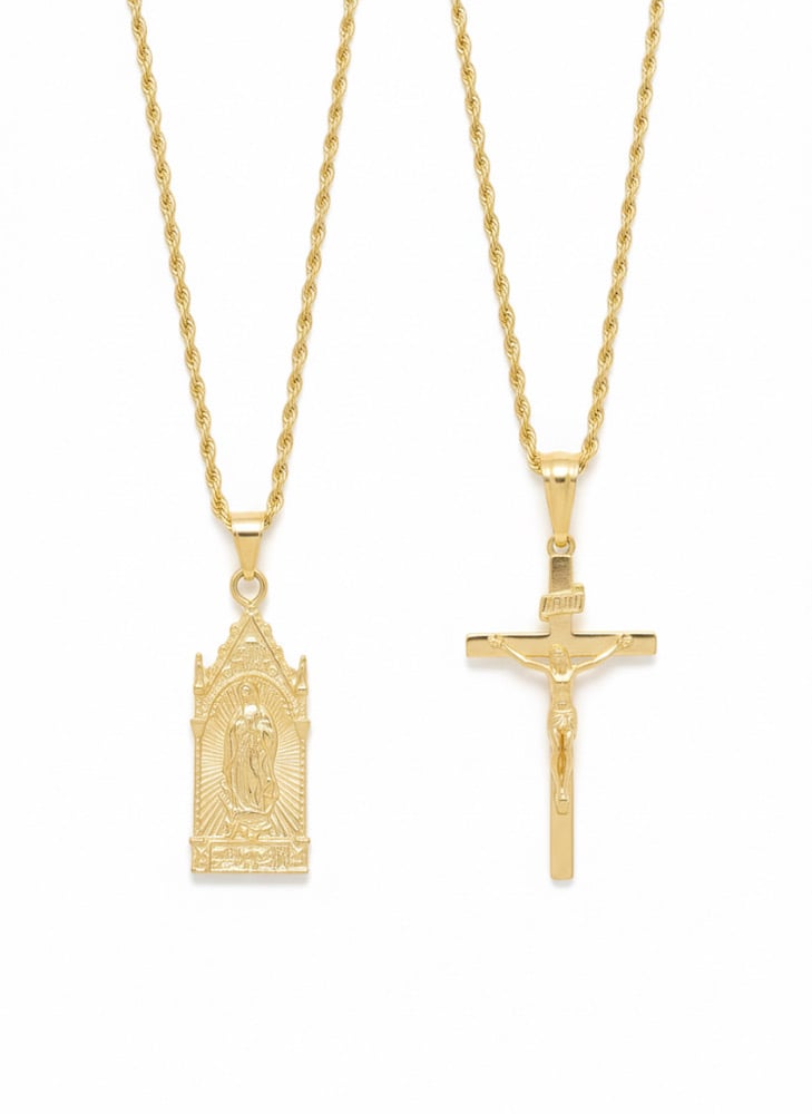 This exquisite set features two meticulously crafted pieces: a 3mm 14K gold Plated rope chain and a stunning pendant. Designed for both men and women The set includes a classic cross chain and a powerful St. Mary Pendant, perfect for adding a touch of elegance and symbolism to any outfit.